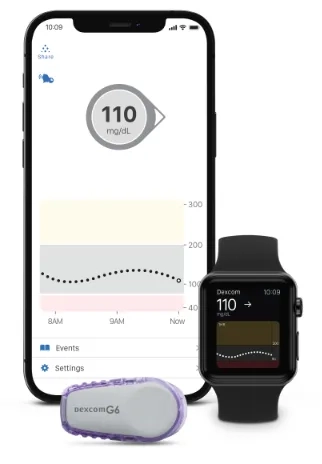 The Dexcom G6 is a continuous glucose monitor (CGM) that tracks your blood sugar without finger sticks. A small sensor worn on your skin sends real-time glucose readings to your phone or receiver, with alerts for high and low levels.