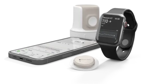 The Dexcom G7 is a continuous glucose monitor (CGM) that lets you track your blood sugar without finger sticks. A small sensor worn on your body sends real-time readings to your phone, showing your current glucose level, trends, and alerts if your levels go too high or too low.