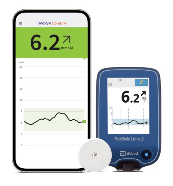 The FreeStyle Libre 2 is a continuous glucose monitor (CGM) that lets you check your blood sugar without fingersticks. A small sensor worn on the back of your arm sends readings to your phone or reader, showing your current number, trends, and alerts if your levels go too high or low.